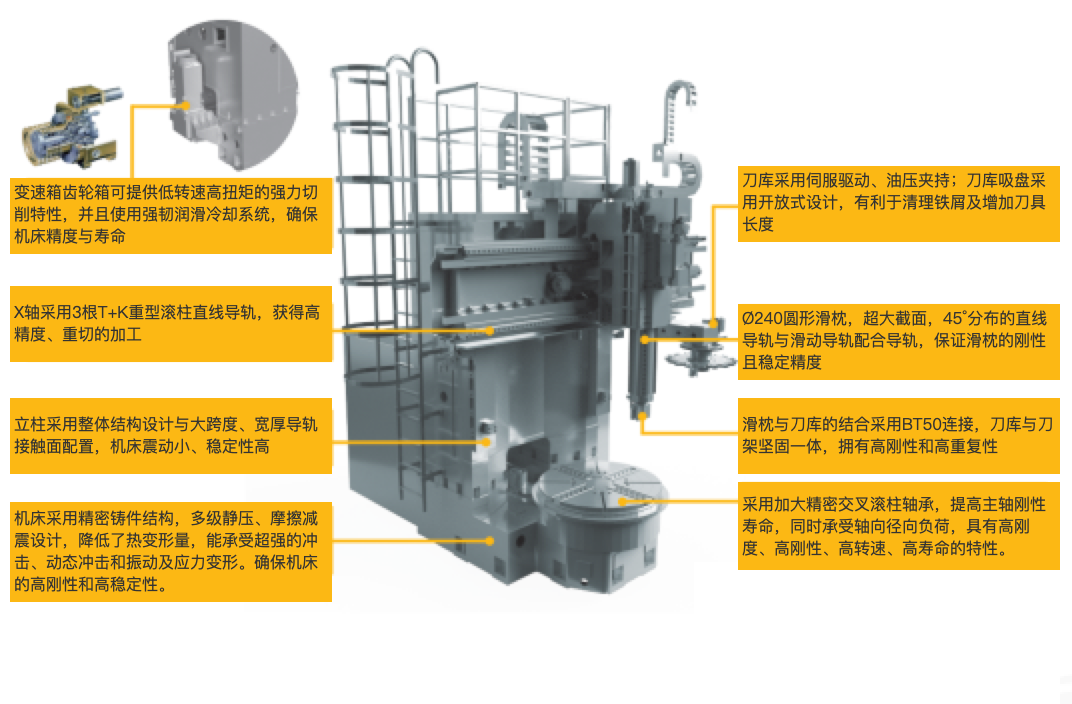 | 5 | 机床的主传动由宽域主轴伺服电动机驱动,经二段式变速箱(自动2档)和高精度二级齿轮变速。 | 噪音低、可靠性高 |